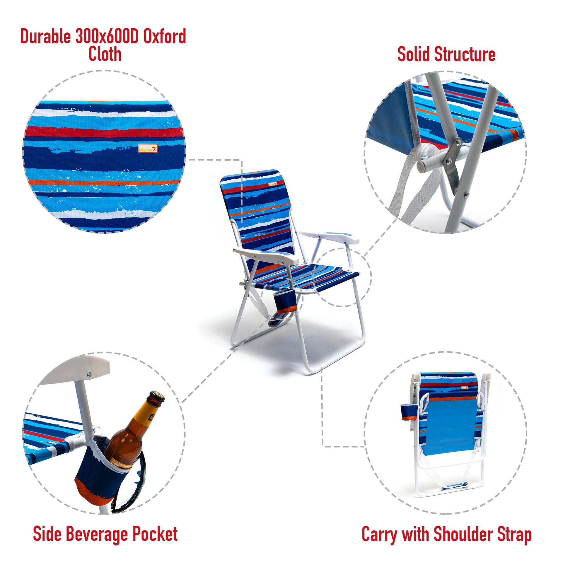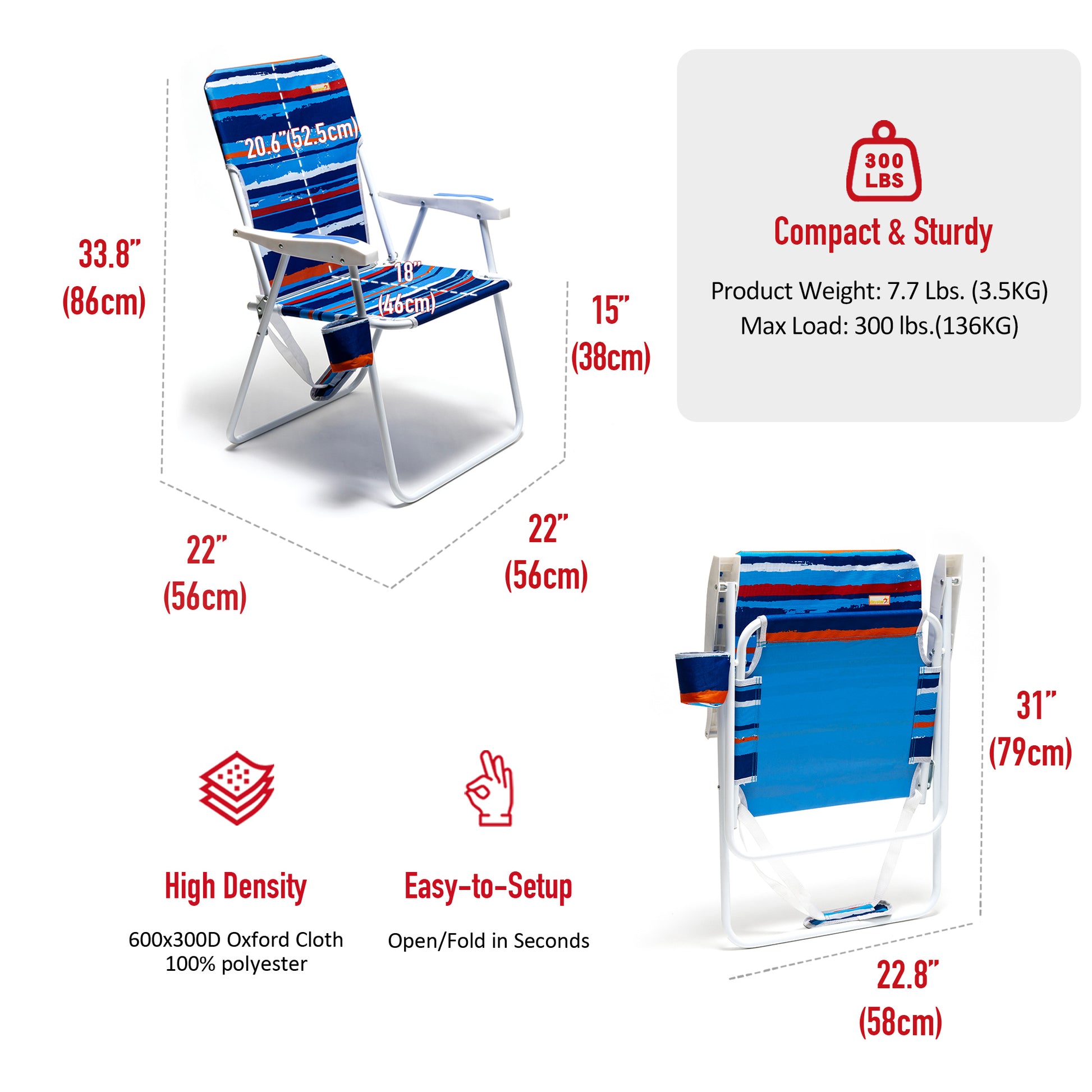 - Built to Last : The sturdy lightweight aluminum with powder coating construction affords up to 300 LBS (136KG) weight and the portable beach chair weights 11.3 LBS (5.16KG). The 600x300D Oxford Cloth & 200g mesh has great strength, durability, and breathability. You don't have to worry for the heavy-duty use, either to buy a new camping chair in the near future.