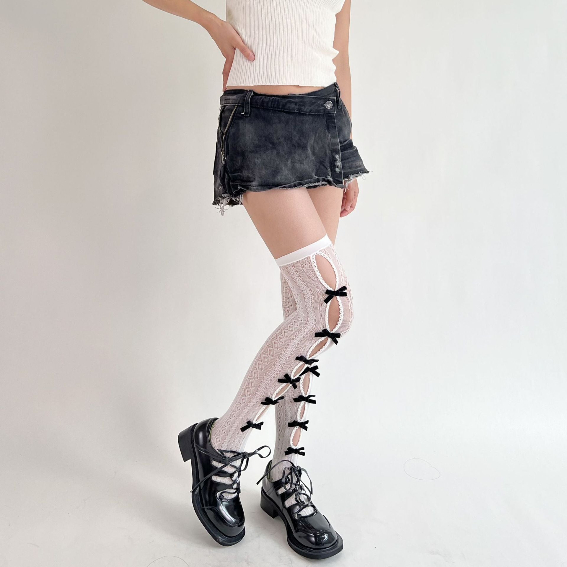 Handmade Hollow Flocked Bow Lace Thigh Socks