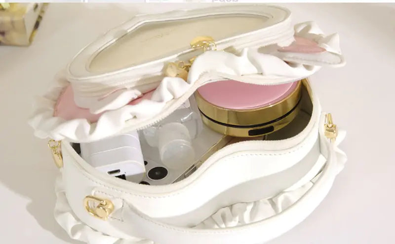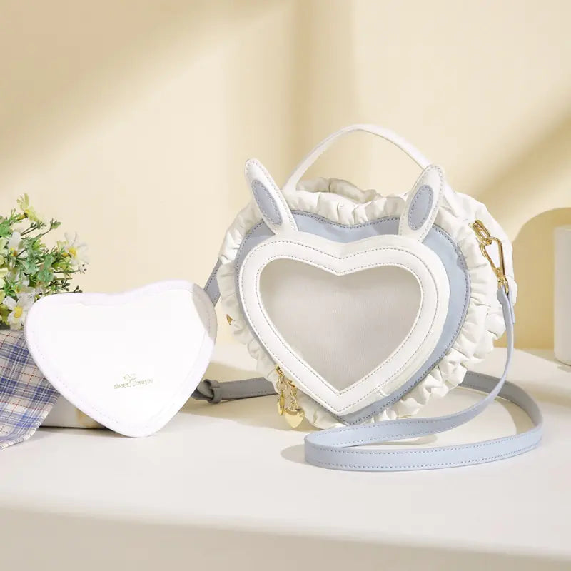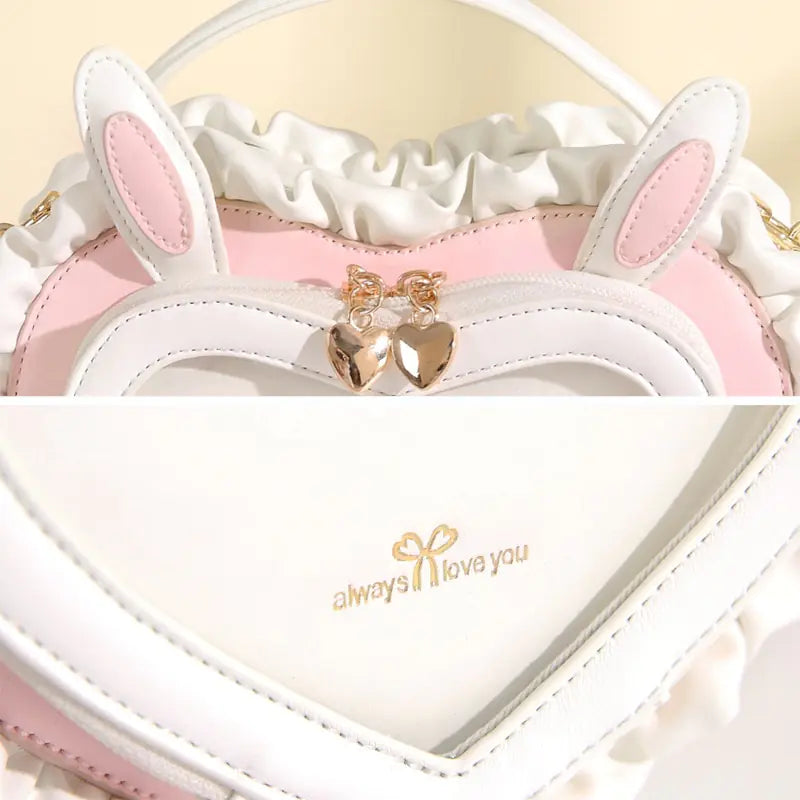 Introducing the Kawaii Bunny Ears Heart Shape Lolita Shoulder Bag and Purse; a stylish and sophisticated handbag for the modern woman. This bag offers comfort, convenience, and timeless design that will accent any outfit you choose. With its cute bunny ears heart shape, it provides an eye-catching accessory to your wardrobe and adds an aura of sophistication to your overall style. Its clear designer finish gives it a touch of added glamour and the badge makes it a perfect present for any occasion. It also features a crossbody strap for versatile carrying options such as over the shoulder or messenger-style wearing. The top zip closure ensures all your items are secure, while the inner pockets allow you to store all your items easily and conveniently. Let this Kawaii Bunny Ears Heart Shape Lolita Shoulder Bag be your go-to choice when you want something stylish as well as convenient! Please note, measured manually, there may be slight differences in size up to 1-3cm.