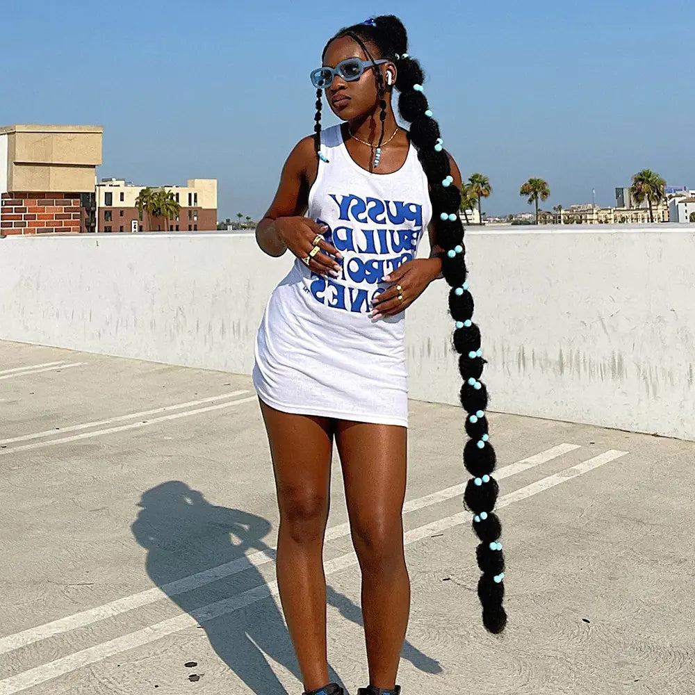 Introducing the Letter Print White Rib Tank Dress. The perfect piece of street fashion for your summer look this season. Crafted from a durable, stretch ribbed material in classic white and cut to body-hugging fit, this dress is designed for irresistible style and comfort. It features a bold letter print on the front for a contemporary finish and an overall modern-streetwear feel. Perfect for any occasion or casual day out, the Letter Print White Rib Tank Dress is a must have for your summer wardrobe. Tailored with excellence, this women's mini dress is available in various sizes to ensure the perfect fit every time. Add some sass to your outfit and order today!