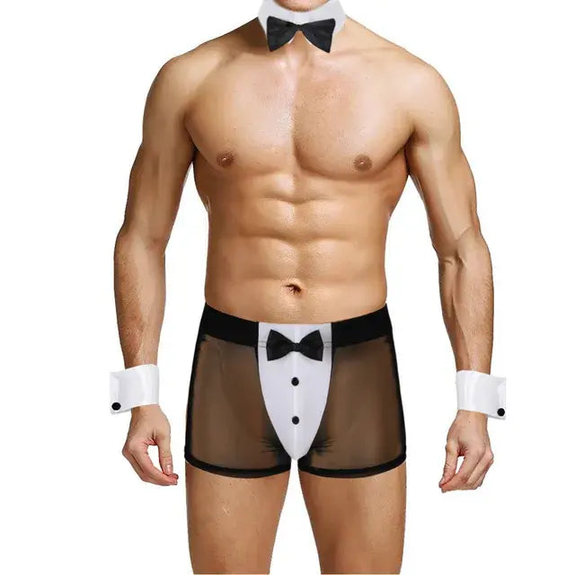 Men's Waiter Cosplay Lingerie Sexy Tuxedo Costume Role Play Uniform See Through Boxers Shorts with Bunny Ears Headband Collar