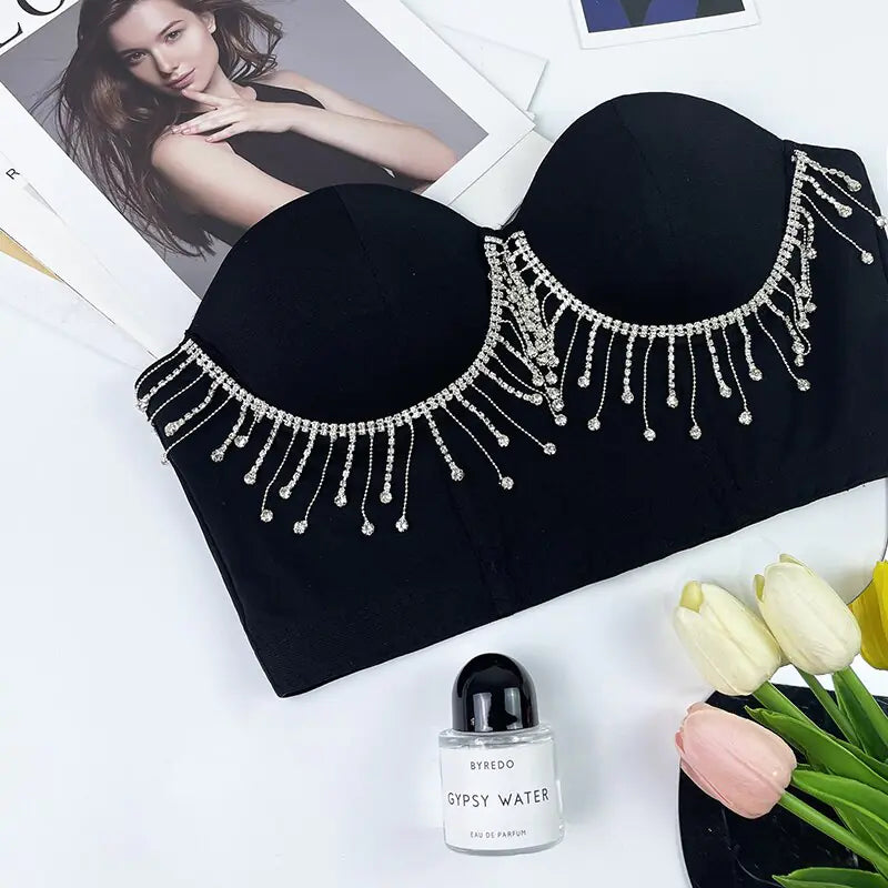 Introducing our Sleeveless Off-Shoulder Corset Top β where glamour meets fashion in a dazzling display of diamonds and tassels, creating a sexy silhouette thatβs both chic and confident! ππ Designed for the modern trendsetter, our corset crop top is more than just underwear; it's a solid statement piece that exudes elegance. The off-shoulder style, adorned with fashion-forward diamonds and tassels, makes this top the perfect blend of playful and sophisticated. Whether you're stepping into a special occasion or adding a touch of glamour to your everyday look, our Sleeveless Off-Shoulder Corset Top ensures you stand out in style. The backless bustier design enhances your confidence, making every moment a runway moment. Upgrade your wardrobe β embrace the allure of our Fashion Diamond Tassel Corset Crop Top and let your style sparkle with sophistication! β¨π #DiamondDazzle #ChicConfidence